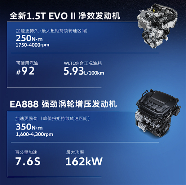 动力方面,380TSI车型搭载第三代2.0T EA888发动机与DSG七速湿式双离合变速箱,最大功率162kW,峰值扭矩350Nm,0-100km/h加速时间为7.6秒;300TSI车型搭载1.5T EA211发动机+DQ200七速湿式双离合变速箱。
